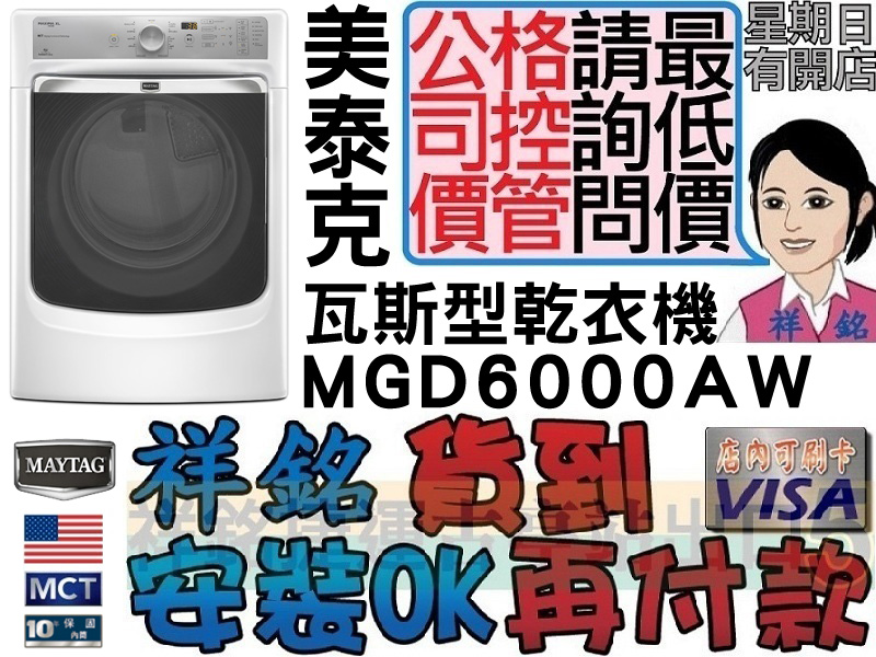 MGD6000AW特價(含稅給發票、含運送、樓層搬運、標準安裝和舊機回收) 全台運送,偏遠地區運費另議請先詢問我們祥銘貿易,謝謝您!離島地區無運送,不便之處請見諒!! MAYTAG美泰克15KG瓦斯型乾衣機有蒸氣功能MGD6000AW MGD6000AW商品規格 ‧型號:MGD6000AW ‧容量:15公斤 ‧顏色:白色 ‧MGD6000AW尺寸:寬686 × 深791 × 高965mm ‧額定消耗電功率:630W ‧電壓:120V / 60Hz ‧熱源:22000BTU(天然或桶裝) ‧產地:美國 ‧全機1年保固 ‧馬達10年保固 MGD6000AW商品功能 ‧溫和微風乾衣系統 ‧智慧型濕度控制 ‧頂級不銹鋼內筒 ‧8種乾衣行程 ‧5種感應乾衣行程 ‧蒸氣衣物恢復清新功能 ‧冷風風乾行程 ‧防皺保護程序 ‧5種乾衣溫度選擇 ‧3種定時乾衣行程 ‧3種乾度選擇 ‧適合熨燙響鈴(微濕乾度) ‧定時乾衣調整時間(+/-) ‧內筒照明燈 ‧面板控制鎖 本網頁的產品規格內容和圖檔為原廠提供,僅供參考,若有錯誤或更改以原廠實際產品為準 網路與門市一同販售,下標購買前請先溝通詢問是否還有貨,避免雙方交易糾紛,感謝您,祝交易愉快^_^ 販售全型號MAYTAG美泰克商品,歡迎來電(店)詢價,謝謝
