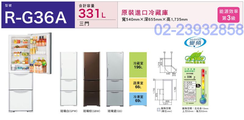 2019年2月11日~2019年3月31日 .型號:RG36A .門數:三門 .顏色:琉璃棕(GBW) 琉璃瓷(GS) 琉璃白(GPW) .容量:331 冷藏室:196 蔬果室:66 冷凍室:69 .RG36A尺寸:寬540 x 深655 x 高1735(mm) .智慧型觸碰面板◎熄灯即隱藏 .冷藏室上方層架:強化玻璃棚架*3 .能源效率分級:第3級 .自動製冰◎ 我們祥銘貿易 .直流變頻壓縮機◎ .R600a新冷媒◎ RG36A商品特色 .自動製冰。 .精品級琉璃時尚外觀(強化玻璃門扉)。 .琉璃觸碰式操作面板,熄燈即隱藏,簡潔更有型。我們祥銘貿易 .深度65.5cm系統家具最適尺寸。 .冷藏室上置,拿取食物更方便。 .急速冷凍鎖住美味,R-600a 環保新冷媒。 .高保濕蔬果室,食物更鮮甜,水份不流失。 我們祥銘貿易 .奈米鈦抗菌除臭濾網。 .LED照明燈(冷藏室),強化玻璃棚架。 107年10月1日起購買此機型享有延長保固,全機保固1年、機板保固3年、冷媒系統保固3年、壓縮機保固5年 本我們祥銘貿易網頁的產品規格內容和圖檔為原廠提供,僅供參考,若有錯誤或更改,以原廠實際產品為準! 詳細功能請參考日立家電官網 網路與門市一同販售,下標購買前請先溝通詢問我們祥銘貿易是否還有貨,避免雙方交易糾紛,如遇商品缺貨可預訂,貨進口到台灣就可以馬上送到您府上,感謝您,祝交易愉快^_^ 販售全型號日立家電商品,歡迎來電我們祥銘貿易店詢價 此價格是我們祥銘貿易送到台北市、新北市都會區的價格,新北市都會區包括五股區、泰山區、三重區、土城區、中和區、永和區、汐止區、新店區、新莊區、樹林區、蘆洲區、板橋區。 送到新北市偏遠地區、基隆市、桃園縣里程費另議。 |
