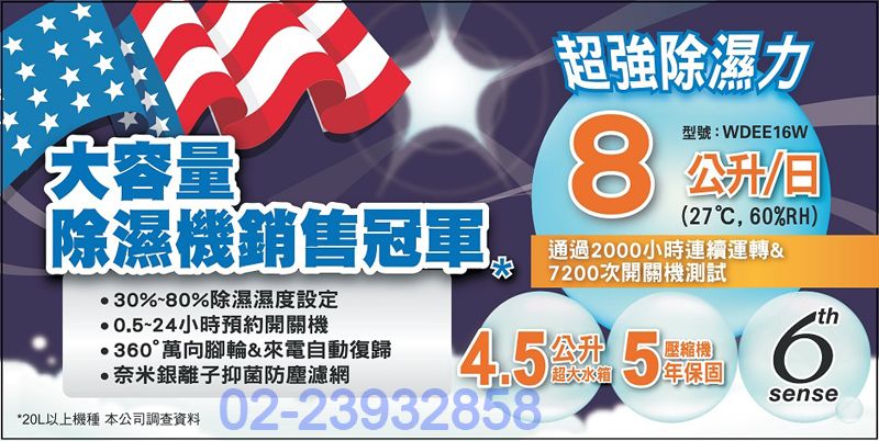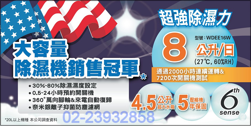 | WDEE16W特價元(含稅我們祥銘貿易給發票、含運送、樓層搬運) 全台運送,偏遠地區運費另議請先詢問,謝謝您! Whirlpool惠而浦8公升除濕機型號WDEE16W WDEE16W商品規格 WDEE16W每日除濕能力:1日8公升(室溫27℃,相對溼度60%的環境下) ‧ 濕度可調整30%~80%除濕濕度設定 ‧ 0.5~24小時預約開關機 WDEE16W尺寸:寬356 x 深288 x 高505mm ‧ 色彩:典雅白 ‧ 水箱容量:4.5公升 ‧ 出風方式:上吹式 ‧ 出風量(cfm):H150 / L130 ‧ 適用溫度:5~35℃ ‧ 電源:115V / 60 Hz ‧ 噪音:48dBA ‧ 重量:13.7公斤 ‧ 產地:中國 ‧ 冷媒:R410A ‧ 機能種類:B式 ‧ 適用空間:~11坪 ‧ 消耗電功率:198W ‧ 能源因數值(EF):1.68 ‧ 國家能源效率認證:4級 WDEE16W商品特色 ‧ 30%~80%除濕濕度設定 ‧ 人體適濕 ‧ 風速選擇(高,低,自動) ‧ 360度萬向腳輪 我們祥銘貿易 ‧ 來電自動復歸 ‧ 奈米銀離子抑菌防塵濾網 ‧ IPX1防滴水保護,用於乾燥潮濕衣物時最安心 ‧ 九項高規格安全裝置 ‧ 通過2000小時連續運轉及7200次開關機測試 ‧ 超大按鍵 ‧ 連續排水 我們祥銘貿易 ‧ 上出風口,乾燥衣物更快速 全機保固1年 冷媒系統保固3年 壓縮機保固5年 本我們祥銘貿易網頁的產品規格內容和圖檔僅供參考,若有錯誤或更改,以原廠實際產品為準! 網路與門市一同販售,下標購買前請先詢問我們祥銘貿易是否還有貨,避免雙方交易糾紛,如遇商品缺貨可預購,貨進口到台灣就可以馬上送到您府上,感謝您,祝交易愉快^_^ 販售全型號惠而浦商品,歡迎來電(店)我們祥銘貿易詢價 小家電(除濕機、空氣清淨機、吸塵器...等等),外縣市我們祥銘貿易委託物流寄送,買後如需退貨,我們祥銘貿易會先請物流將貨物收回,再將貨款退回給您,同意者再下標訂購,謝謝 |