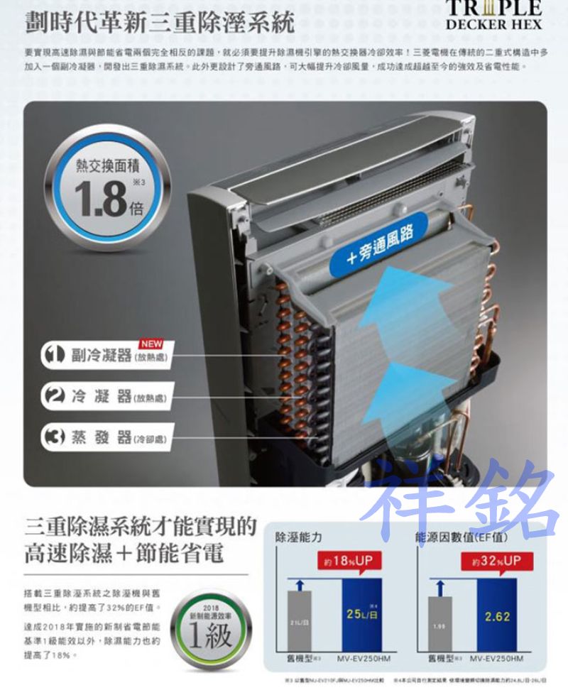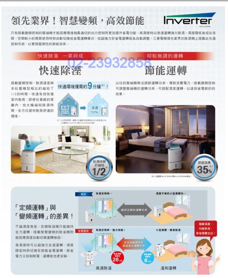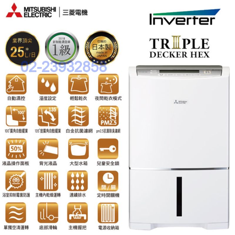 | MJ-EV250HM特價元(含稅、含運送) 貨到付款運費100元另計 全台運送,偏遠地區運費另議請先詢問,謝謝您! MITSUBISHI三菱24.8公升變頻除濕機型號MJ-EV250HM MJ-EV250HM商品規格 機身尺寸:寬410 × 深299 × 高630 mm 顏色:白色系 水箱容量:5.5L 適用坪數:16~31坪 濾網種類:集塵 運轉音(強/弱):46/35 (dB) 機體重量:17.9 kg 連續排水:可接排水管 除濕方式:微電腦電子式,變頻壓縮機 消耗電功率:395W 能源效率等級:第一級 適用室溫範圍:攝氏5度~40度 電源:110V 產地:日本 標準檢驗局商品檢驗碼R32174 MJ-EV250HM商品特色 ‧ 自動濕控 ‧ 濕度設定(節能自動) 我們祥銘貿易 ‧ 輕鬆乾衣(衣類乾燥標準) ‧ 夜間乾衣模式 ‧ 浴室抑黴防護 ‧ 機體內部乾燥運轉 我們祥銘貿易 ‧ 連續排水 ‧ 定時開關機(1-12小時) ‧ 100°廣角自動擺葉(上吹擺葉) ‧ 135°廣角自動擺葉 ‧ 白金抗菌濾網 ‧ 銀離子抗菌消臭濾網(PM2.5) ‧ 單獨空清運轉 ‧ 底部滑輪(四輪自在) 我們祥銘貿易 ‧ 本體提把 ‧ 電源收納箱 ‧ 液晶操作面板 ‧ 背光液晶版 ‧ 兒童安全鎖 全機保固3年 本我們祥銘貿易網頁的產品規格內容和圖檔僅供參考,若有錯誤或更改,以原廠實際產品為準! 網路與門市一同販售,下標購買前請先詢問我們祥銘貿易是否還有貨,避免雙方交易糾紛,如遇商品缺貨可預購,貨進口到台灣就可以馬上送到您府上,感謝您,祝交易愉快^_^ 販售全型號惠而浦商品,歡迎來電(店)我們祥銘貿易詢價 小家電(除濕機、空氣清淨機、吸塵器...等等),外縣市我們祥銘貿易委託物流寄送,買後如需退貨,我們祥銘貿易會先請物流將貨物收回,再將貨款退回給您,同意者再下標訂購,謝謝 |
