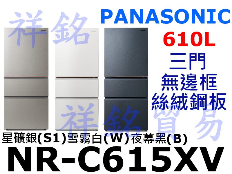 NR-C615XV特價元(含稅我們祥銘貿易給發票、含運送、標準安裝和舊機回收)無電梯2樓(含)以上每層工錢加200元 下訂前請詢價,請提供我們祥銘貿易送哪一區?幾樓?有無電梯?可加快報價,謝謝 購買前請先準確量好預擺設的位子高度、寬度和深度,運送時可能會發生門、樓梯轉角處和走道太小,冰箱無法送入內的情形,所以選購前請記得先準確量家中門、樓梯轉角處和走道尺寸,下訂單時可以將門尺寸或特殊環境、情況告知我們祥銘貿易,希望能為各位網友提供更好的商品和服務。 Panasonic國際牌610L三門無邊框絲絨鋼板型號NR-C615XV NR-C615XV商品規格 .顏色:雪霧白(W) / 星礦銀(S1) / 夜幕黑(B) .外觀尺寸:寬775 x 深780 x 高1834mm .包裝箱尺寸:寬806 x 深820 x 高1923 mm .有效容積:610 L .冷凍室:130 L .冷藏室:320 L .蔬果室:118 L .微凍結室:16 L .製冰室:4 L