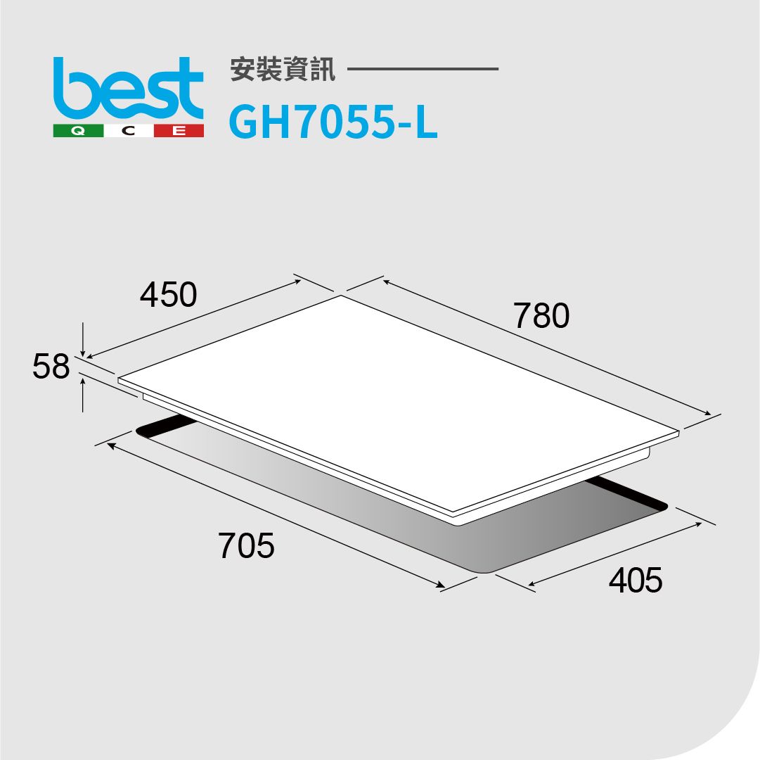 下訂前請詢價,請告訴我們祥銘貿易要送哪一區?幾樓?有無電梯?謝謝 安裝費另計,請先詢問,此商品無貨到付款 best貝斯特黑玻三口高效能瓦斯爐型號GH7055-L GH7055-L商品規格 ‧ GH7055-L產品尺寸:寬780 x 深450 x 高58 mm ‧ 顏色:黑色玻璃 ‧ 爐口數 : 三口 ‧ 電壓:110V / 60Hz ‧ 燃氣消耗量(總計):7.9kW ‧ 燃氣消耗量(各別):5.0kW/1.6kW/1.3kW ‧ 消耗電功率:0.22W 我們祥銘貿易 ‧ 熱效率:NG1 44% / LPG 45% ‧ 能源效率等級:第4級 GH7055-L商品特色 ‧ 創新式多段火力調整 ‧ 瓦斯自動偵測切斷裝置 ‧ 嵌入式鑄鐵爐架平穩不滑動 ‧ 商檢登錄字號:31228 我們祥銘貿易 ‧ 能源效率標示在商品規格頁籤 全機保固一年,登錄再享一年延長保固 本我們祥銘貿易網頁的產品規格內容和圖檔為原廠提供,僅供參考,若有錯誤或更改以原廠實際產品為準 網路與門市一同販售,下標購買前請先溝通詢問我們祥銘貿易是否還有貨,避免雙方交易糾紛,如遇商品缺貨可預購,感謝您,祝交易愉快^_^