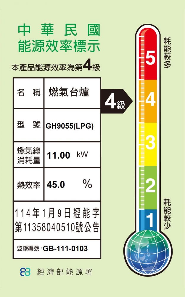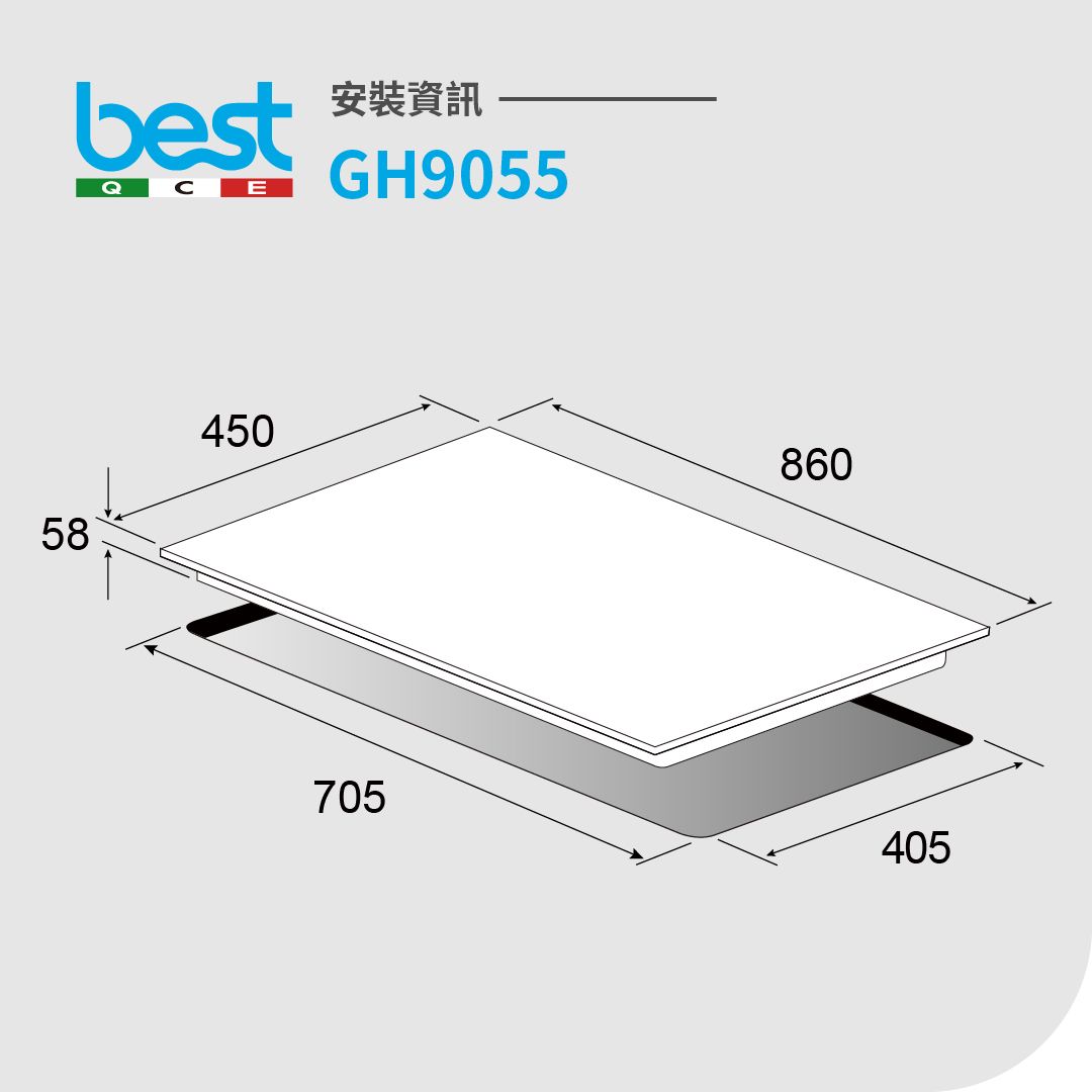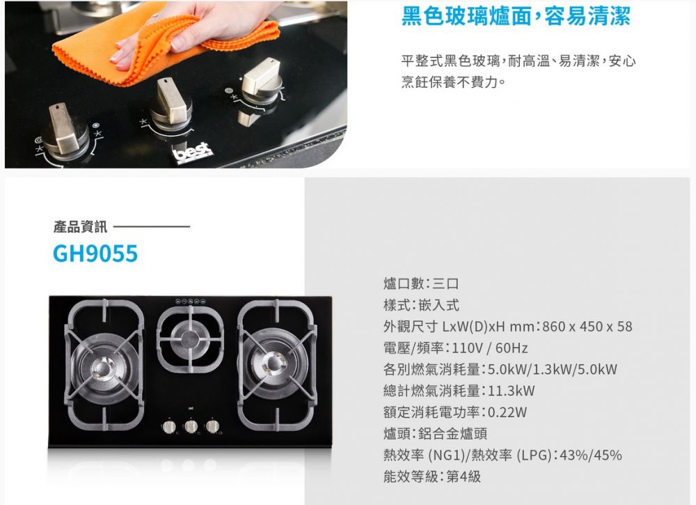 下訂前請詢價,請告訴我們祥銘貿易要送哪一區?幾樓?有無電梯?謝謝 安裝費另計,請先詢問,此商品無貨到付款 best貝斯特黑玻三口高效能瓦斯爐型號GH9055 GH9055商品規格 ‧ GH9055產品尺寸:寬860 x 深450 x 高58 mm ‧ 顏色:黑色玻璃 ‧ 爐口數 : 三口 ‧ 電壓:110V / 60Hz ‧ 燃氣消耗量(總計):11.3kW 我們祥銘貿易 ‧ 燃氣消耗量(各別):5.0kW/1.3kW/5.0kW ‧ 消耗電功率:0.22W ‧ 熱效率:NG1 43% / LPG 45% ‧ 能源效率等級:第4級 GH9055商品特色 ‧ 創新式多段火力調整 ‧ 瓦斯自動偵測切斷裝置 ‧ 嵌入式鑄鐵爐架平穩不滑動 我們祥銘貿易 ‧ 商檢登錄字號:31228 ‧ 能源效率標示在商品規格頁籤 全機保固一年,登錄再享一年延長保固 本我們祥銘貿易網頁的產品規格內容和圖檔為原廠提供,僅供參考,若有錯誤或更改以原廠實際產品為準 網路與門市一同販售,下標購買前請先溝通詢問我們祥銘貿易是否還有貨,避免雙方交易糾紛,如遇商品缺貨可預購,感謝您,祝交易愉快^_^