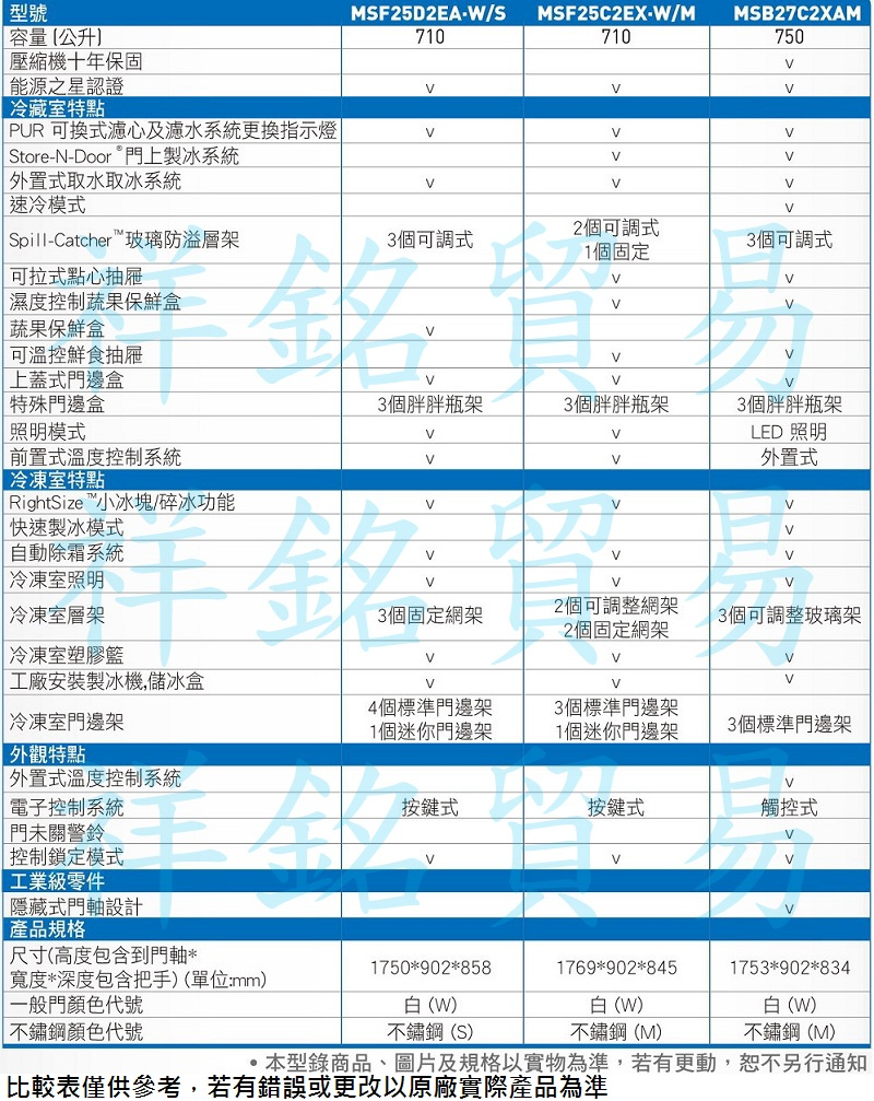| MSB27C2XAM特價(含稅給發票、含運送、樓層搬運、標準安裝和舊機回收) MAYTAG美泰克750L雙門對開冰箱不鏽鋼色MSB27C2XAM MSB27C2XAM商品規格 型號:MSB27C2XAM 顏色:不鏽鋼色 顏色代號不鏽鋼 M 容量:750公升 電壓:120V / 60Hz 產地:墨西哥 MSB27C2XAM尺寸:寬902 × 深834 × 高1753mm(高度含門軸,深度含把手) MSB27C2XAM商品功能 ‧美國能源之星認證 ‧PUR 可換式濾心及濾水系統更換指示燈 ‧Store-N-Door® 門上儲冰系統 ‧外置式取水取冰系統 ‧速冷模式 ‧Spill-Catcher™ 玻璃防溢層架:3個可調式 ‧可拉式點心抽屜 ‧濕度控制蔬果保鮮盒 ‧可溫控鮮食抽屜 ‧上蓋式門邊盒 ‧特殊門邊盒:3個胖胖瓶架 ‧照明模式 LED ‧前置式溫度控制系統 ‧RightSize™ 小冰塊/碎冰功能 ‧快速製冰模式 ‧自動除霜系統 ‧冷凍室照明 ‧冷凍室層架:3個可調整玻璃架 ‧冷凍室塑膠籃 ‧工廠安裝製冰機,儲冰盒 ‧冷凍室門邊架:3個標準門邊架 ‧外置式溫度控制系統 ‧觸控式電子控制系統 ‧門未關警鈴 ‧控制鎖定模式 ‧隱藏式門軸設計 ‧壓縮機10年保固 本網頁的產品規格內容和圖檔為原廠提供,僅供參考,若有錯誤或更改以原廠實際產品為準 網路與門市一同販售,下標購買前請先溝通詢問是否還有貨,避免雙方交易糾紛,感謝您,祝交易愉快^_^ 販售全型號MAYTAG美泰克商品,歡迎來電(店)詢價,謝謝 全台運送,偏遠地區運費另議請先詢問,謝謝您!離島地區無運送,不便之處請見諒!! |