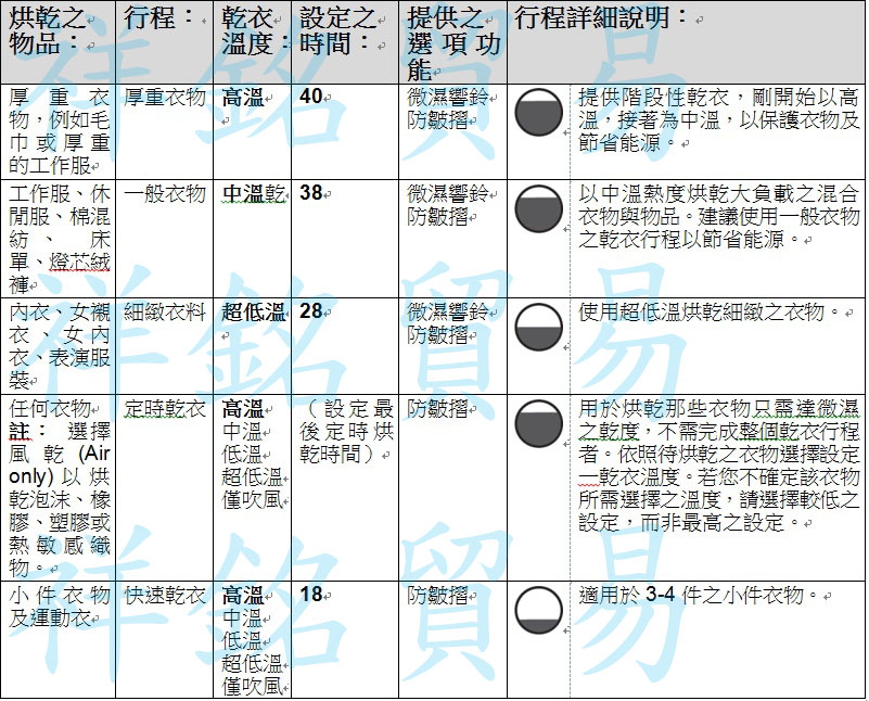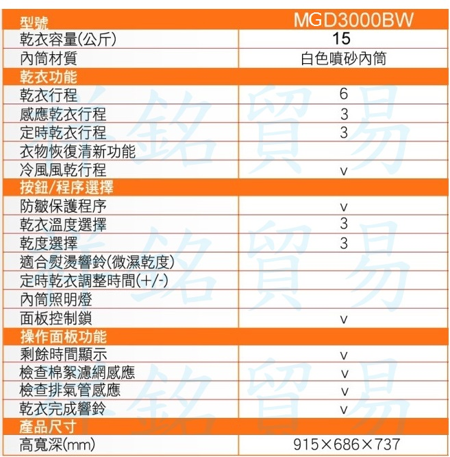 | MGD3100BW特價25500(含稅給發票、含運送、樓層搬運、標準安裝和舊機回收) 惠而浦和美泰克的乾衣機都很耐用,都是惠而浦集團旗下的品牌,消費者可選擇哪個品牌賣的便宜就跟誰買 MGD3000BW乾衣機可堆疊在MHW6000XW或MHW7000XW洗衣機上 MAYTAG美泰克15KG瓦斯型滾筒式乾衣機MGD3000BW MGD3000BW商品規格 型號:MGD3000BW(瓦斯) 顏色:白色 烘衣容量:15公斤 烘乾熱源:瓦斯 額定消耗電功率:630W 電壓:120V / 60Hz 熱源:22000BTU(天然或桶裝) MGD3000BW尺寸:寬686 × 深791 × 高965mm 產地:美國 MGD3000BW商品功能 ‧溫和微風乾衣系統 ‧智慧型濕度控制 ‧白色噴砂內筒 ‧6種乾衣行程 ‧3種自動感應乾衣行程 ‧3種定時乾衣行程 ‧冷風風乾行程 ‧防皺保護程序 ‧3段乾衣溫度選擇 ‧3段衣物乾度選擇 ‧乾衣完成響鈴 ‧面板控制鎖 ‧剩餘時間顯示 ‧自動檢查棉絮濾網 ‧自動偵測排風狀況 ‧自動檢查排氣管 ‧乾衣完成響鈴 ‧可選購15公斤專用滾筒烘鞋架MA-800 ‧全機保固1年 ‧馬達軸受組品保固5年 本網頁的產品規格內容和圖檔為原廠提供,僅供參考,若有錯誤或更改以原廠實際產品為準 網路與門市一同販售,下標購買前請先溝通詢問是否還有貨,避免雙方交易糾紛,感謝您,祝交易愉快^_^ 販售全型號MAYTAG美泰克商品,歡迎來電(店)詢價,謝謝 全台運送,偏遠地區運費另議請先詢問我們祥銘貿易,謝謝您!離島地區無運送,不便之處請見諒!! |