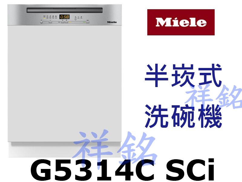 G5314C SCi送大台北地區價格(含稅給發票、含運送、無電梯樓層搬運費另計) 下訂前請告訴我們祥銘貿易要送哪一區? 幾樓? 有無電梯?可加快報價速度 (嵌入式機型安裝需額外收費,要自備門板,有需要安裝請再洽詢安裝費) 德國Miele半嵌式洗碗機型號G5314C SCi G5314C SCi商品規格 .G5314C SCi機體尺寸:寬598 x 深570 x 高805 mm .G5314C SCi安裝尺寸:寬600 x 深570 x 高805-870 mm .顏色:不鏽鋼 .電壓:220V/60Hz/1.8kW/9A G5314C SCi商品特色 行程選擇 .一般 .自動 45-65°C .輕柔洗滌 45°C 我們祥銘貿易 .QuickPowerWash 65°C .加強 75°C .附加功能:快洗程序、AutoOpen自動開門、關閉補充提示、額外清潔、額外烘乾
