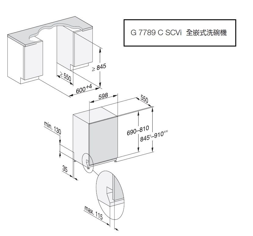 (嵌入式機型安裝需額外收費,要自備門板,有需要安裝請再洽詢安裝費) 德國Miele全嵌式洗碗機型號G7789CSCVi XXL K2O FF G7789CSCVi XXL K2O FF商品規格 .G7789CSCVi XXL K2O FF機體尺寸:寬598 x 深550 x 高845 mm .G7789CSCVi XXL K2O FF安裝尺寸:寬600 x 深550 x 高845-910 mm .面板顏色:黑色 .電壓:220V/60Hz/1.8kW/10A G7789CSCVi XXL K2O FF商品特色 行程選擇 .標準清洗 .自動感應清洗 45-65°C .ComfortWash45°C .加倍寧靜清洗50°C .QuickPowerWash55°C .衛生清洗75°C .煮食用具清洗75°C .ComfortWash+55°C .SolarSave 我們祥銘貿易 .輕柔清洗45°C .高身物件清洗65°C .意麵 / 飯漬清洗 .玻璃清洗 .清潔本機程序 .鹽漂洗 特色與附加功能 .16人份容量 .AutoOpen自動開門烘乾科技 .獨家AutoDos2.0 洗劑自動投放科技 .FrontFit® 門板無縫嵌合技術 .K2O輕敲自動開門科技 .三層中式碗籃+三支全尺寸沖水臂 .3D餐具托盤+ +Extra Comfort 籃架設計 .Miele@Home Wifi .BrilliantLight 艙內照明 .商用無碳刷馬達 .輕鬆關門設計 .可調光LED照明 .EcoFeedback節能回饋 .熱水進水功能 .顯示剩餘時間顯示 .24 小時延遲啟動 我們祥銘貿易 .FlexiTimer彈性排程功能 .AutoStart自動啟動功能 .新鮮進水功能 .最低噪音值43dBA .聲學/光學功能指示 烘乾系統 .AutoOpen自動開門烘乾 .新一代冷凝烘乾 我們祥銘貿易 .自動偵測烘乾 消耗功率 .最低耗水量 6公升 .最低耗電量 0.45Kwh 控制介面 .觸控面板 安全功能 .兒童安全門鎖 .雙層防水止漏系統 本我們祥銘貿易網頁的產品規格內容和圖檔為原廠提供,僅供參考,若有錯誤或更改,以原廠實際產品為準! 詳細功能請參考Miele家電官網 網路與門市一同販售,下標購買前請先詢問溝通我們祥銘貿易是否還有貨,避免雙方交易糾紛,感謝您,祝交易愉快^_^ 販售全型號Miele商品,歡迎來信或來電(店)我們祥銘貿易詢價
